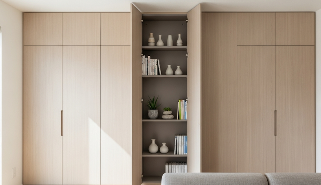 - 天井までの壁面収納: リビングや寝室の一面を、床から天井までの壁面収納にすることで、大容量の収納が実現します。扉を壁と同じ色にすれば、圧迫感を軽減し、空間に統一感が生まれます。