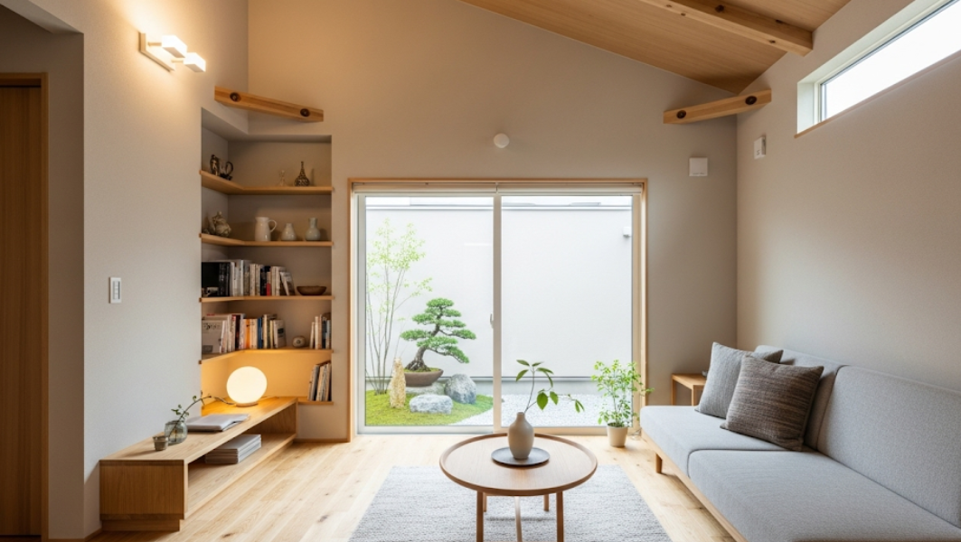 • 勾配天井と化粧梁:平屋ならではの特権である勾配天井は、空間に縦の広がりをもたらし、開放感を格段にアップさせます。コストを抑えつつデザイン性を高める非常に有効なテクニックです。